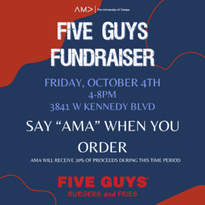 Craving a burger, cajun fries, or how about a milkshake? Join us at our Five Guys fundraiser and enjoy delicious food while supporting the AMA UTampa chapter! AMA will receive 20% of proceeds during this time period, so come out and bring your friends!