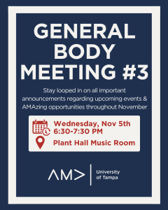 Join AMA for our 3rd General Body Meeting of the fall semester! Get the latest updates and get involved in our AMAzing upcoming events and exciting opportunities happening throughout November.