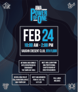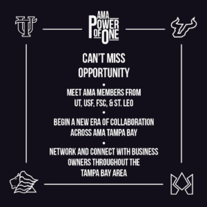 This unique occasion brings together collegiate chapters of AMA Tampa Bay, including UT, USF, FSC, and St. Leo, for a day filled with collaboration, learning, and networking. This event will begin with coffee and icebreakers, transition into a speaker series, break for a social brunch, and finish with an interactive workshop/engaging activity.