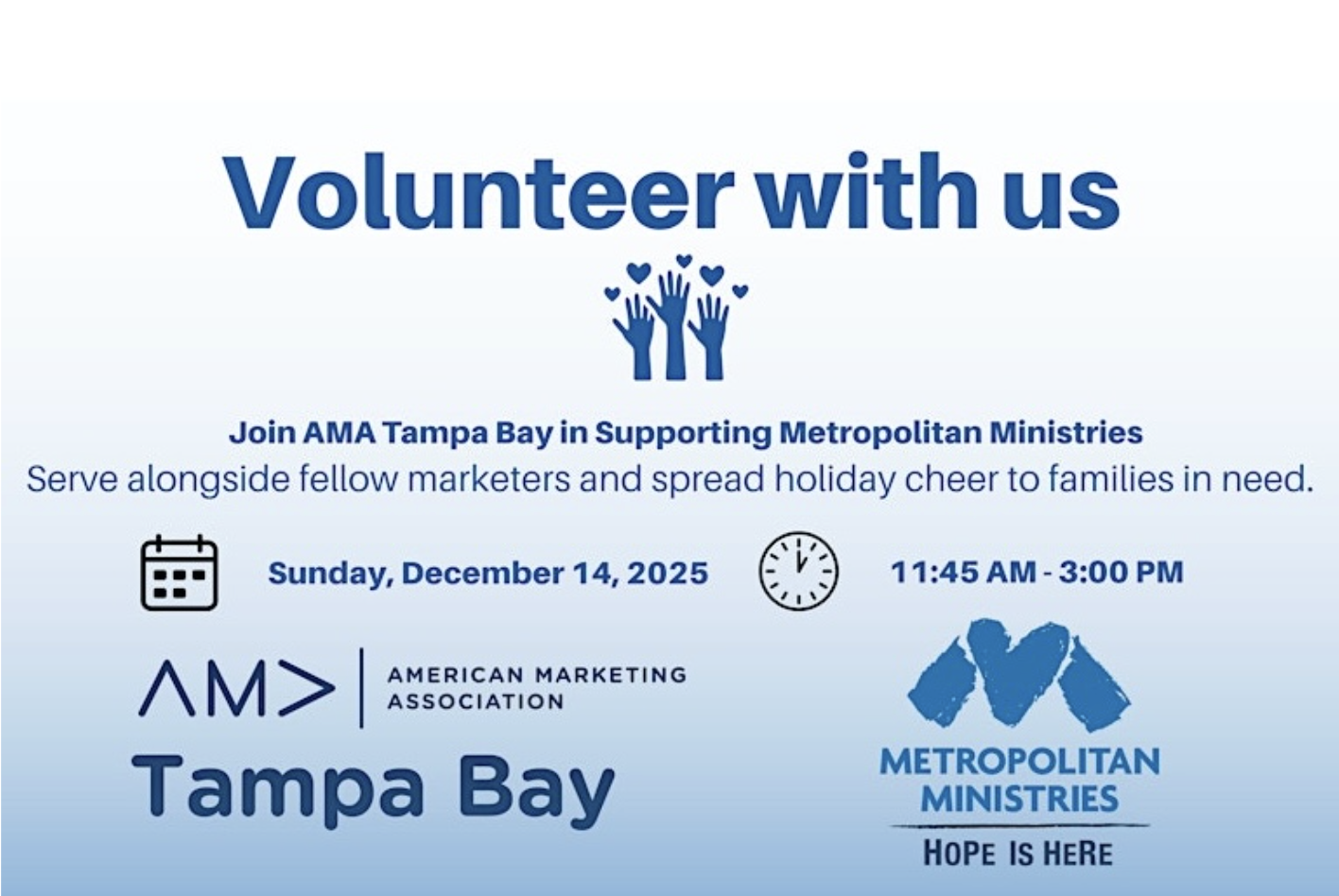 Join AMA Utampa in supporting Metropolitan Ministries. Work alongside fellow marketers and spread holiday cheer to families in need! Sign Up Here!
